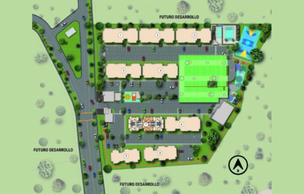 El proyecto corresponde a un Conjunto cerrado reglamentado por Propiedad Horizontal con 594 apartamentos distribuidos en 9 torres (en unidades estructurales sencillas) de 11 pisos, 6 apartamentos por piso, con 594 estacionamientos comunes entre residentes y visitantes para una relación de 1 estacionamiento por cada 1 apartamento, cuenta también con estacionamientos para 20 motocicletas.
